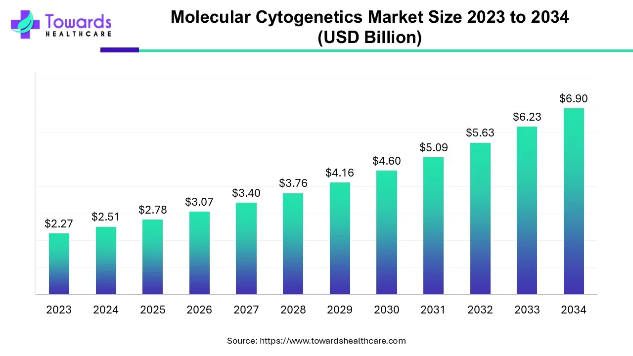 The global molecular cytogenetics market size is calculated at USD 2.78 billion in 2025 and is expected to reach around USD 6.9 billion by 2034, growing at a CAGR of 10.64% for the forecasted period.