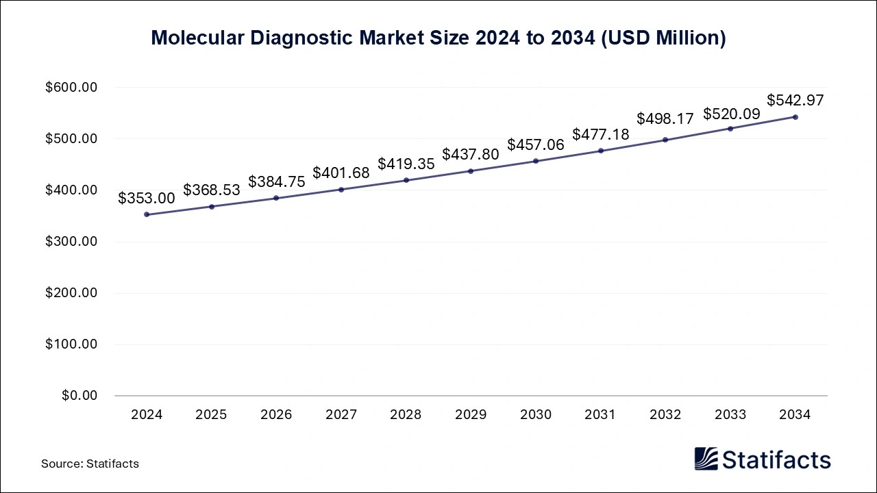 Ottawa, April 21, 2025 (GLOBE NEWSWIRE) — According to Statifacts, the global molecular diagnostic market size was valued at USD 353 million in 2024 and is expected to attain USD 542.97 million by 2034, expanding at a CAGR of 4.4% during the forecast period from 2025 to 2034. The molecular diagnostic market growth is driven by an increase in investment from government and private organizations for the development of many diagnostic service centers, advanced technologies in the healthcare sector, increasing awareness about early diagnosis, and the rising prevalence of infectious diseases like COVID-19, HIV, influenza, pneumonia, and hepatitis.