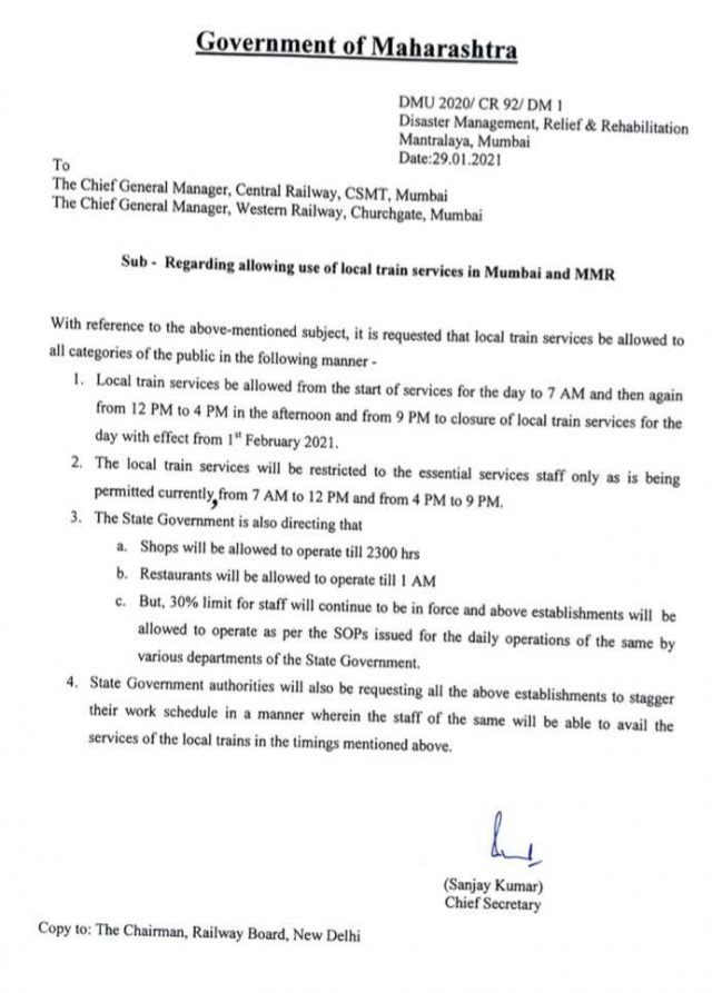In a huge relief for the daily passengers, Mumbai local trains will be resuming for all commuters from February 1. However, commuters will not be able to travel between 7am to 12 in the morning and 4pm to 9pm in the evening.