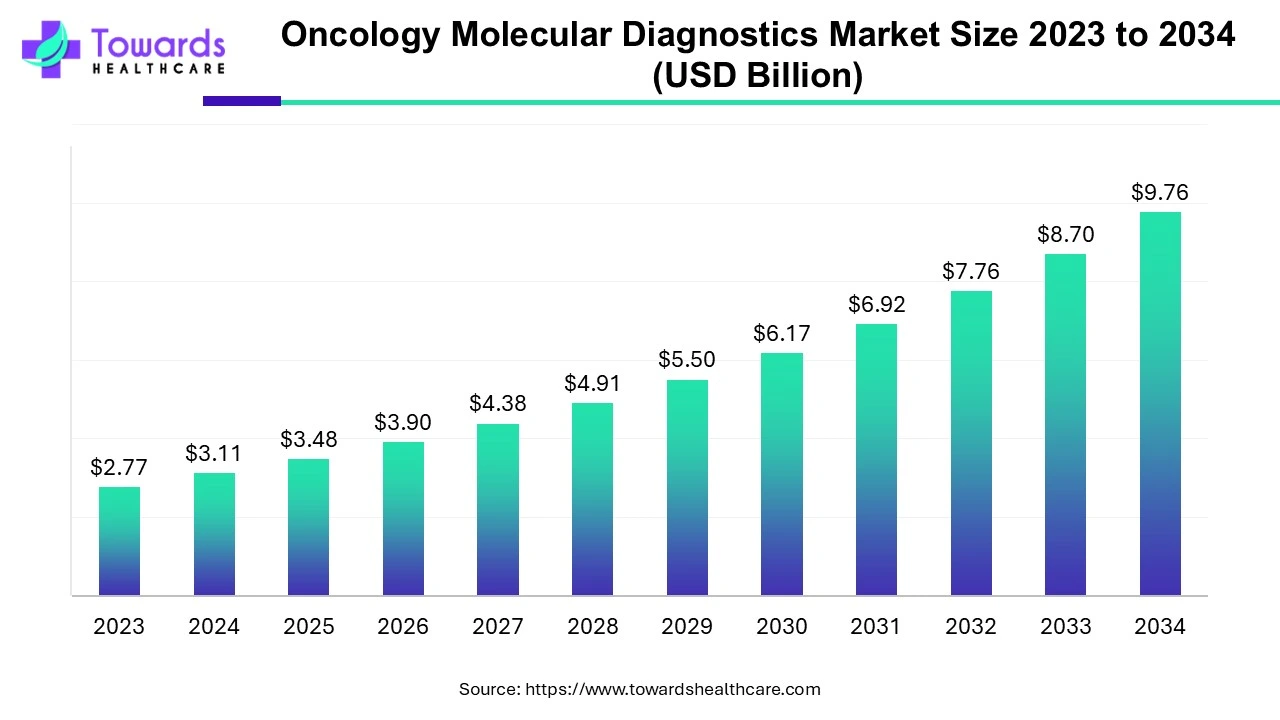 Ottawa, Sept. 05, 2025 (GLOBE NEWSWIRE) — According to a study by Towards Healthcare, a sister company of Precedence Research, the global oncology molecular diagnostics market was estimated at USD 3.11 billion in 2024 and is projected to reach USD 9.76 billion by 2034, growing at a compound annual growth rate (CAGR) of 12.13%.