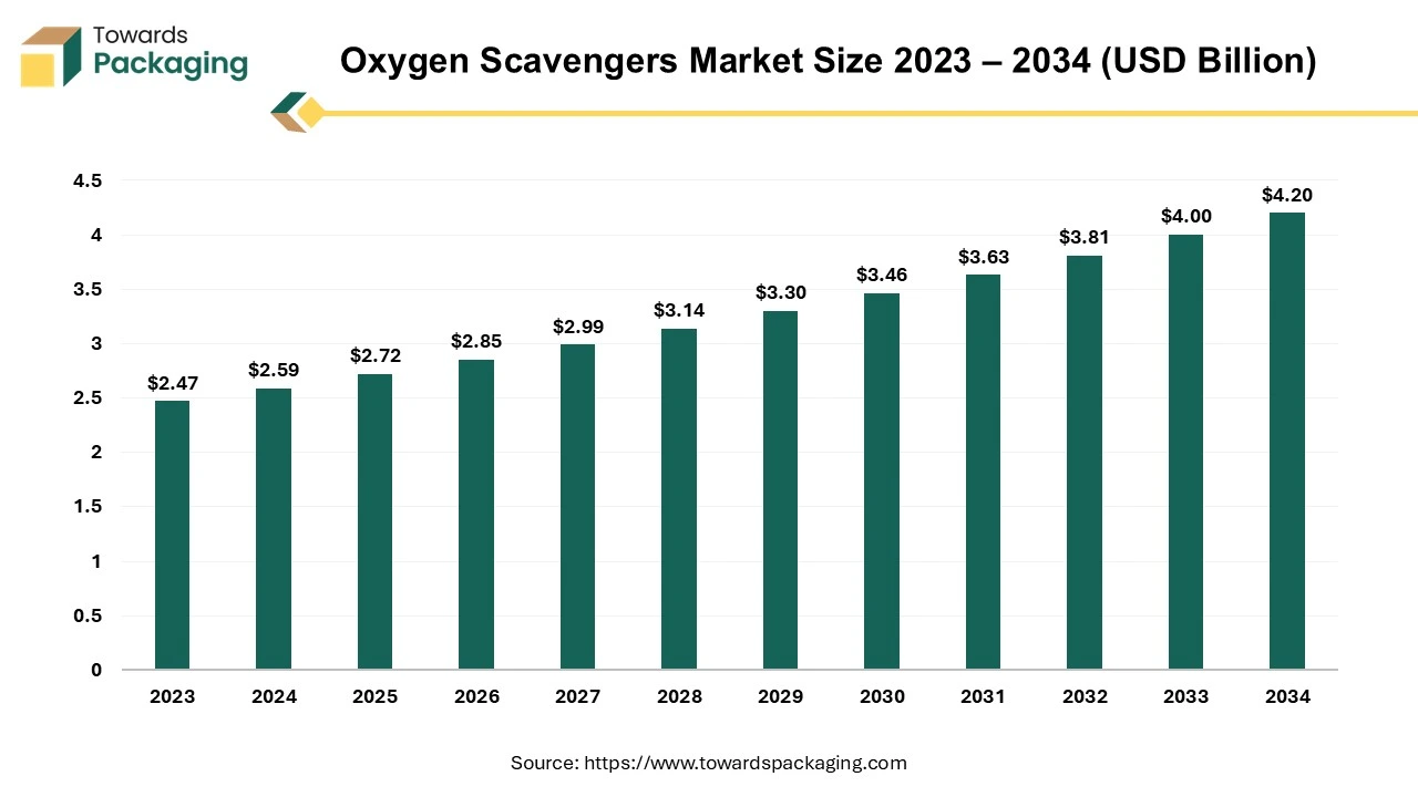 According to Towards Packaging Consultants, the global oxygen scavengers market size stood at USD 2.59 billion in 2024 and is predicted to exceed USD 4.20 billion by 2034, experiencing a CAGR of 5% from 2024 to 2034.