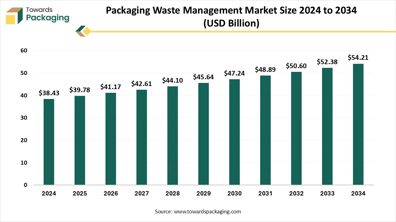 As per market analysts at Towards Packaging, the global packaging waste management market is expected to grow from USD 41.17 billion in 2026 to nearly USD 54.21 billion by 2034, registering a CAGR of 3.5% between 2025 and 2034.