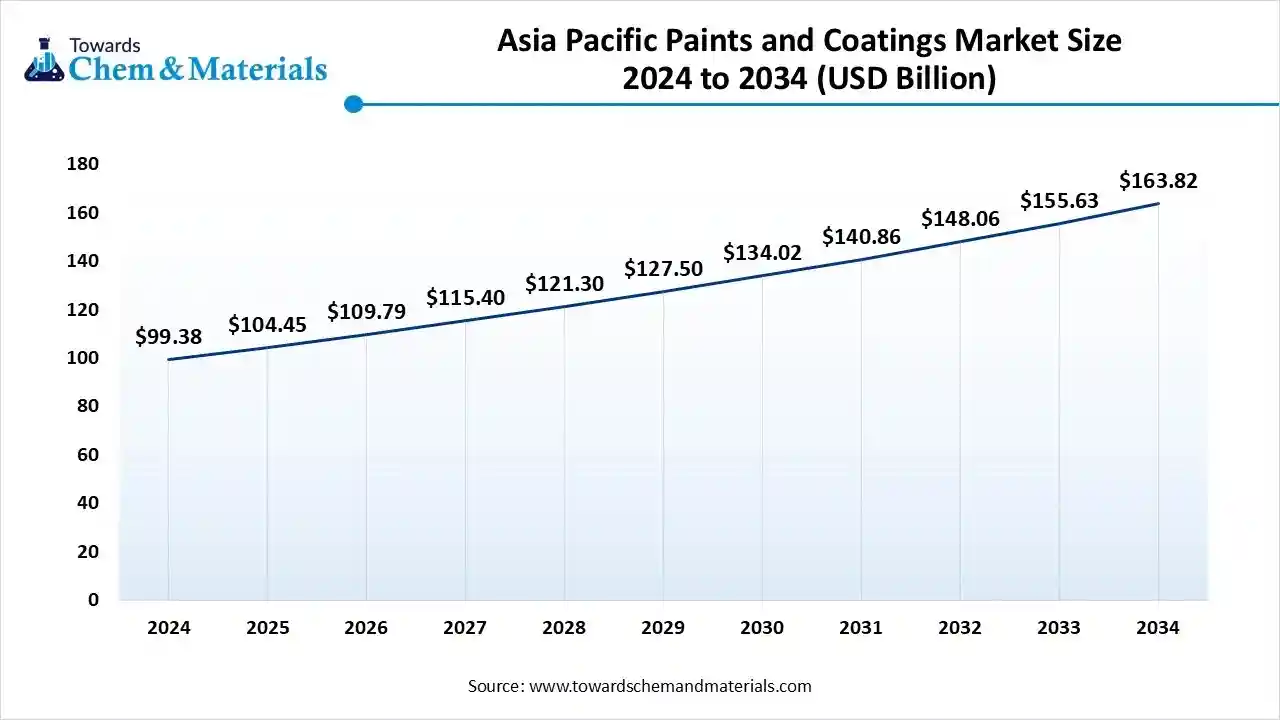 The Asia Pacific paints and coatings market size is estimated at USD 104.45 billion in 2025 and is projected to reach USD 348.04 billion by 2034, growing at a CAGR of 5.11% from 2025 to 2034.