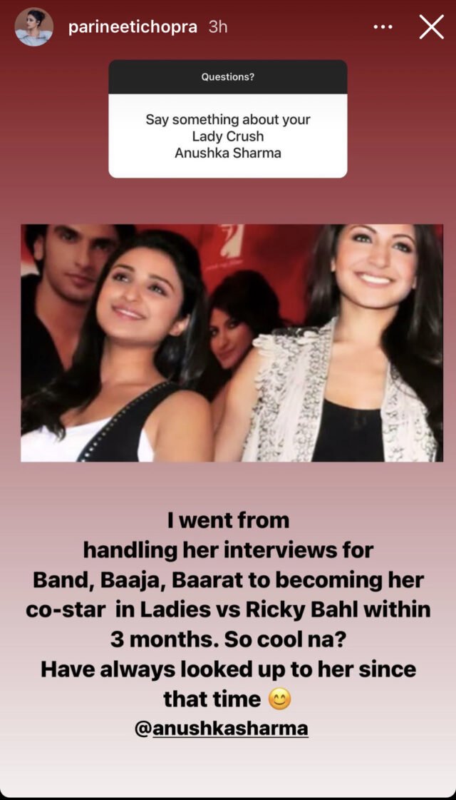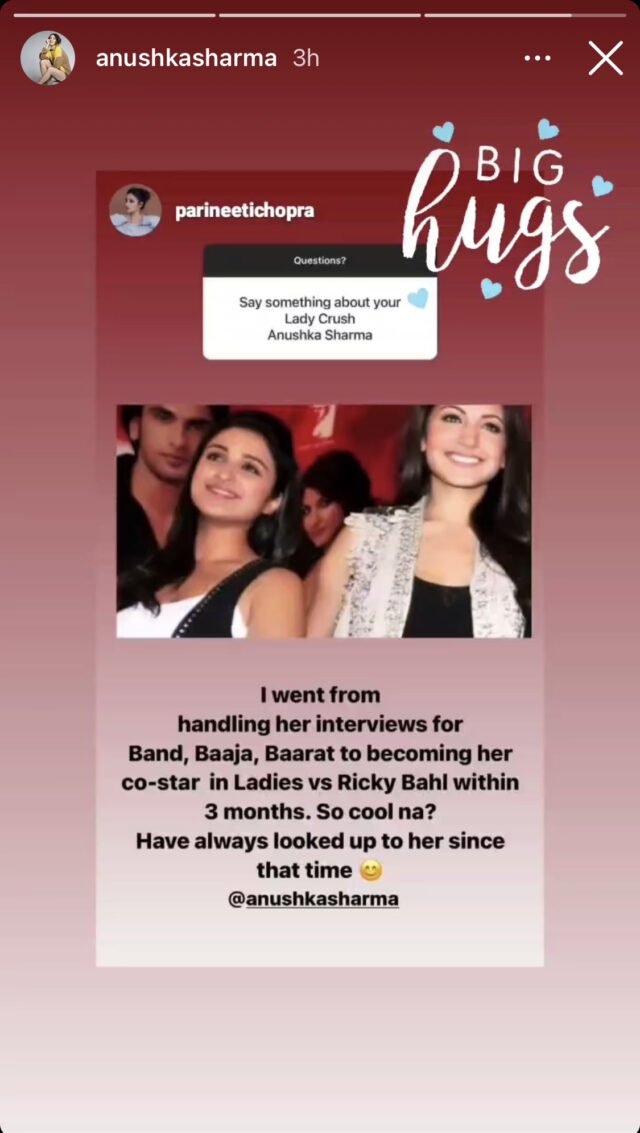 To which Parineeti Chopra replied, “I went from handling her interviews for ‘Band Baaja Baaraat’ to becoming her co-star in ‘Ladies vs Ricky Bahl’ within three months. So cool na? Have always looked up to her since that time. @anushkasharma”