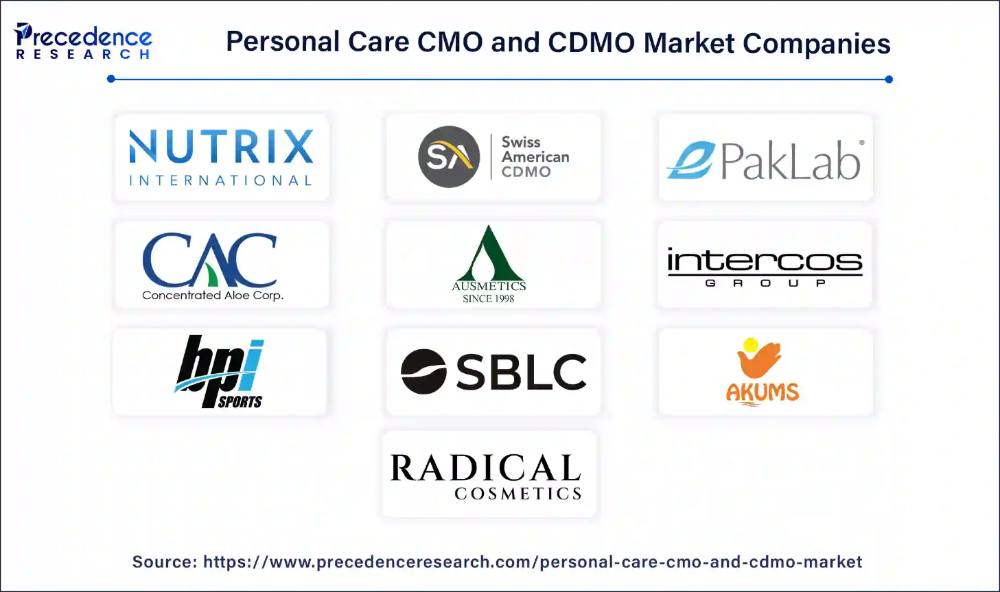 The personal care CMO and CDMO market continues to evolve rapidly and showcases significant advancements through innovations in 2023 and 2024, with a dynamic competitive landscape. Major players such as Arizona Natural Resources Inc., Opal Cosmetics, Intercos S.P.A., Akums Drugs and Pharmaceuticals Ltd., Concentrated Aloe Corporation, etc. hold a prominent position in the personal care CMO and CDMO market.
