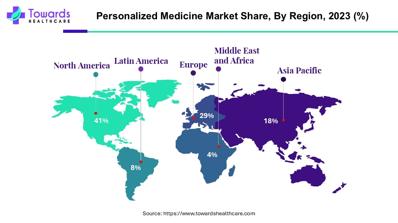 North America held the largest share of the personalized medicine market by 41% in 2023. The expansion of the precision medicine sector in the US is expected to be fueled by increases in financing for research and development (R&D) and healthcare infrastructure expenditures. Furthermore, tremendous progress has been made in treating diseases, including breast and colorectal cancer, because of advancements in precision medicine. Cancer continues to be the second most common cause of death in the US, after heart disease. It is expected that precision medicine would improve the treatment of particular cancer types, including breast and colon cancer, as well as the creation of tailored treatments in oncology. Furthermore, it is expected that the substantial efforts of market participants will support market growth.