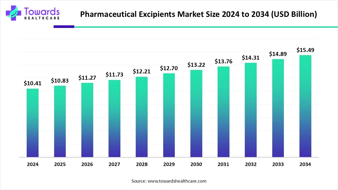 Ottawa, Sept. 11, 2025 (GLOBE NEWSWIRE) — According to a study released by Towards Healthcare, a sister company of Precedence Research, the global pharmaceutical excipients market was valued at USD 10.41 billion in 2024 and is anticipated to reach nearly USD 15.49 billion by 2034, advancing at a CAGR of 4.06% over the forecast period.