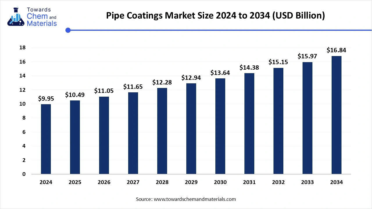According to Towards chem and Materials Consultants, the global pipe coatings market size is calculated at USD 10.49 billion in 2025 and is expected to reach around USD 16.84 billion by 2034, growing at a CAGR of 5.40% for the forecasted period.