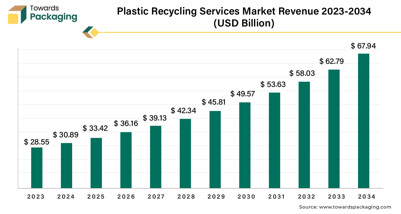 Ottawa, Feb. 06, 2025 (GLOBE NEWSWIRE) — The plastic recycling services market size is projected to reach USD 67.94 billion by 2034, growing from USD 33.42 billion in 2025, at a CAGR of 8.20% during the forecast period from 2025 to 2034. A study published by Towards Packaging a sister firm of Precedence Statistics.