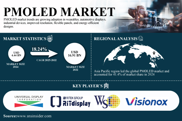 According to the SNS Insider,“The PMOLED Market Size was valued at USD 4.44 billion in 2024 and is expected to reach USD 16.91 billion by 2032, growing at a CAGR of 18.24% during 2025-2032.”