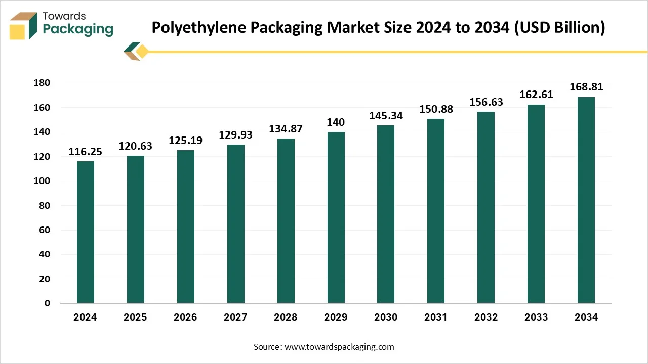According to Towards Packaging consultants, the polyethylene packaging market is forecasted to expand from USD 120.63 billion in 2025 to USD 168.81 billion by 2034, growing at a CAGR of 3.77% from 2025 to 2034.
