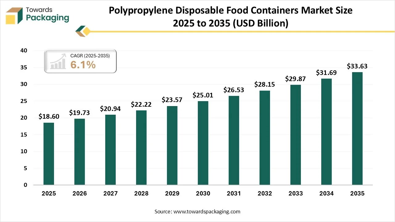 As highlighted by Towards Packaging research, the global polypropylene disposable food containers market, valued at USD 18.60 billion in 2025, is expected to reach USD 33.63 billion by 2035, registering a CAGR of 6.1% throughout the forecast period.