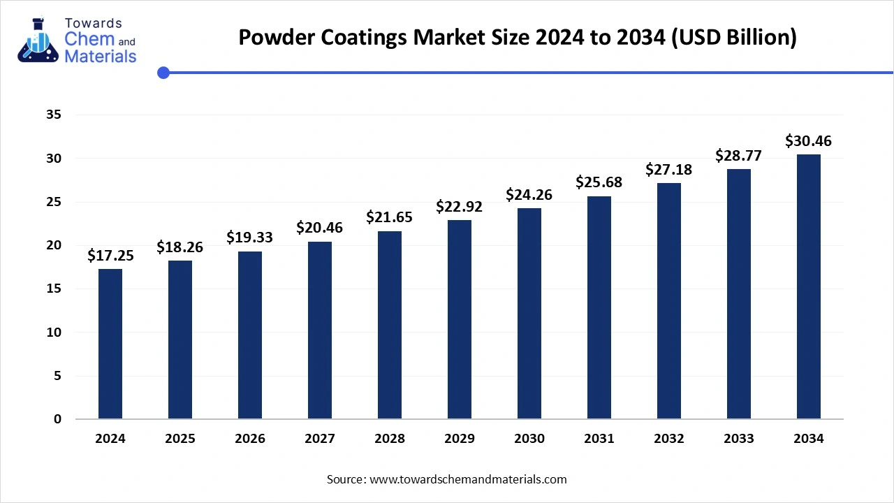 The global powder coatings market size is calculated at USD 18.26 billion in 2025 and is expected to reach around USD 30.46 billion by 2034, growing at a CAGR of 5.85% for the forecasted period.