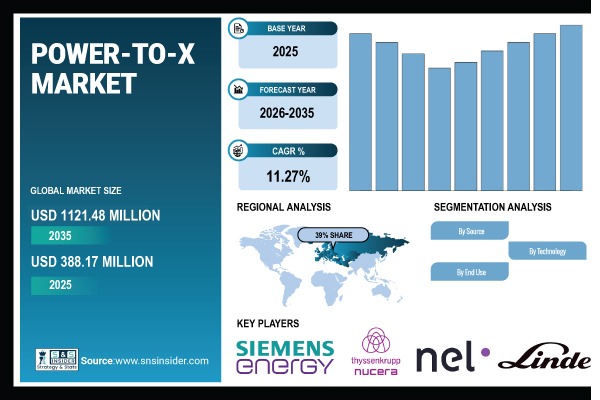 According to the SNS Insider, “The Power-to-X (P2X) Market Size was valued at USD 388.17 million in 2025 and is expected to reach USD 1121.48 million by 2035, growing at a CAGR of 11.27% over 2026-2035.”