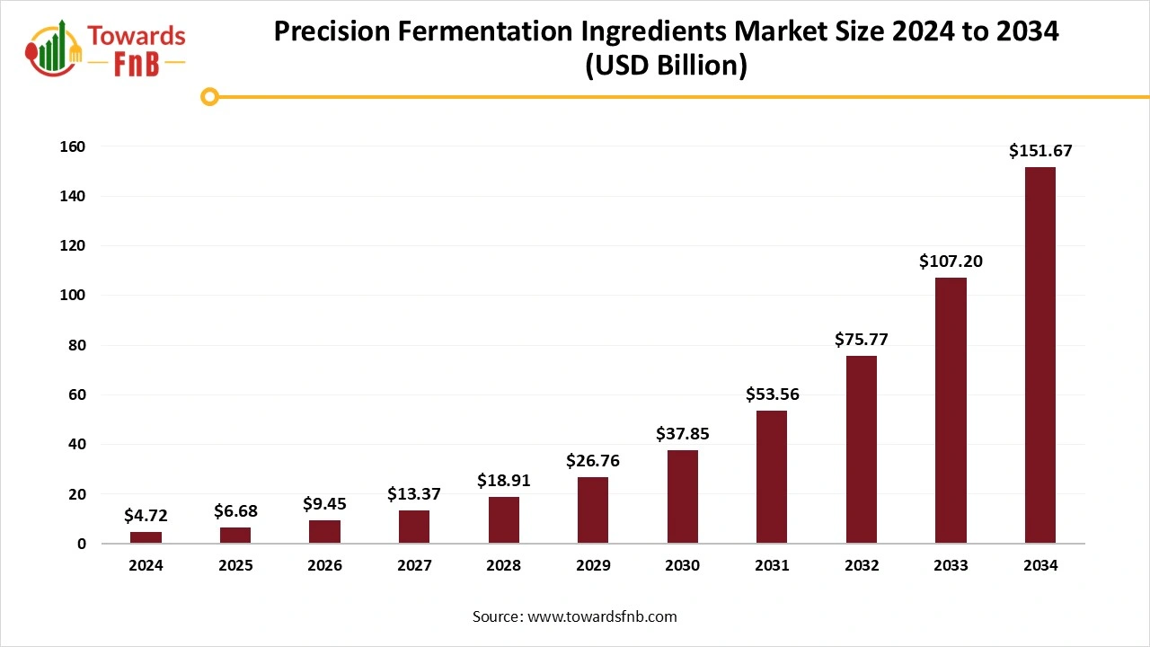 Ottawa, Nov. 20, 2025 (GLOBE NEWSWIRE) — The global precision fermentation ingredients market size stood at USD 4.72 billion in 2024 and is expected to grow steadily from USD 6.68 billion in 2025 to reach around USD 151.67 billion by 2034, according to a report published by Towards FnB, a sister firm of Precedence Research.