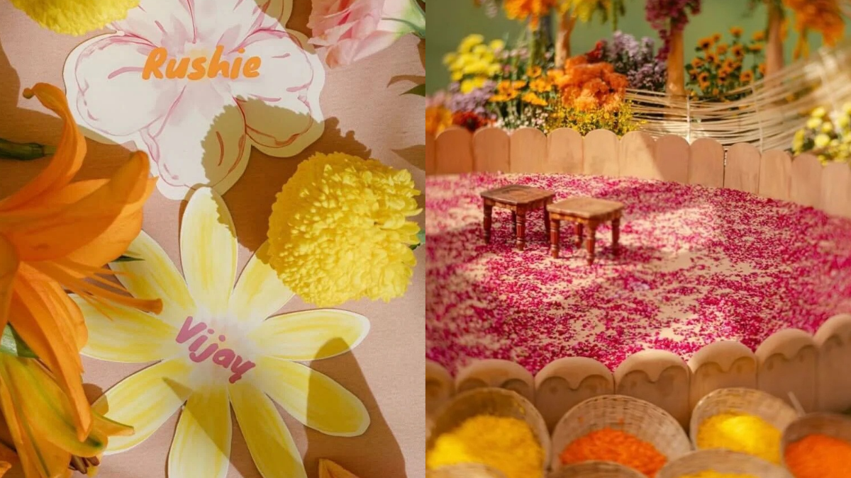 Breaking away from a purely traditional setup, the duo infused their haldi with vibrant Holi elements. Alongside the customary yellow drapes and coordinated seating, colourful pichkaaris were thoughtfully placed around the venue, lending the function a playful and festive character. The decor blended bright splashes of colour with classic haldi tones, creating an atmosphere that felt both lively and meaningful.