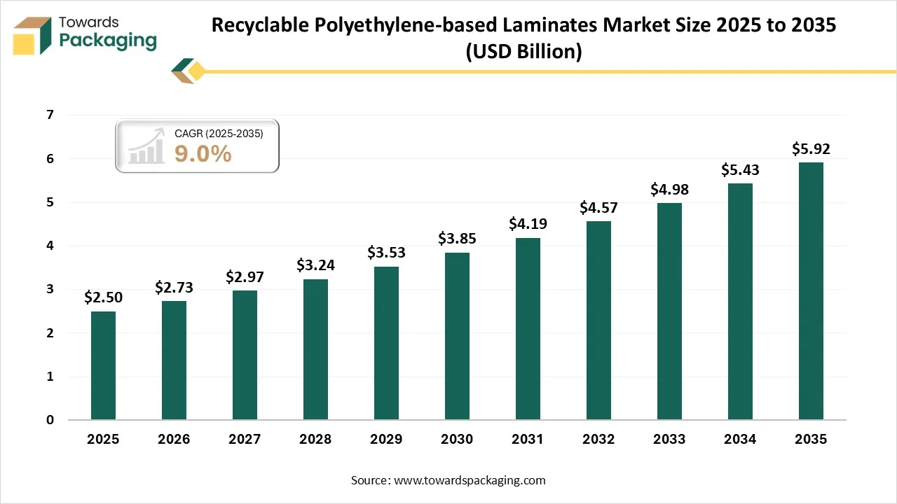 According to Towards Packaging consultants, the global recyclable polyethylene-based laminates market is projected to reach approximately USD 5.92 billion by 2035, increasing from USD 2.5 billion in 2025, at a CAGR of 9.0% during the forecast period 2026 to 2035.