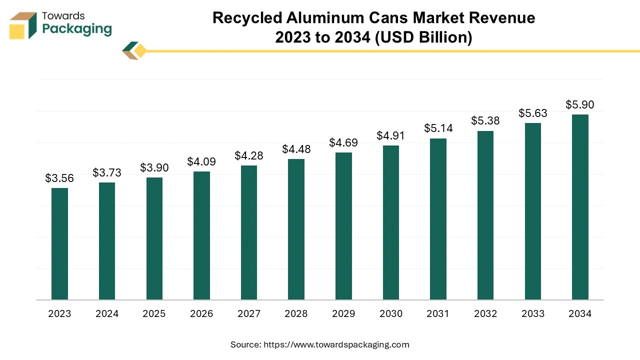 The recycled aluminum cans market size stood at US$ 3.73 billion in 2024 and is predicted to exceed US$ 5.90 billion by 2034, experiencing a CAGR of 4.7% from 2024 to 2034.