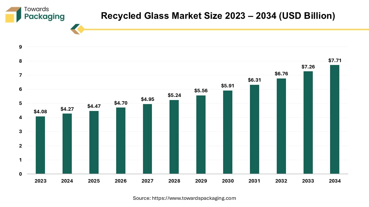 According to Towards Packaging consultants, the global recycled glass market is projected to reach approximately USD 7.71 billion by 2034, increasing from USD 4.47 billion in 2025, at a CAGR of 6.09% during the forecast period 2025 to 2034.