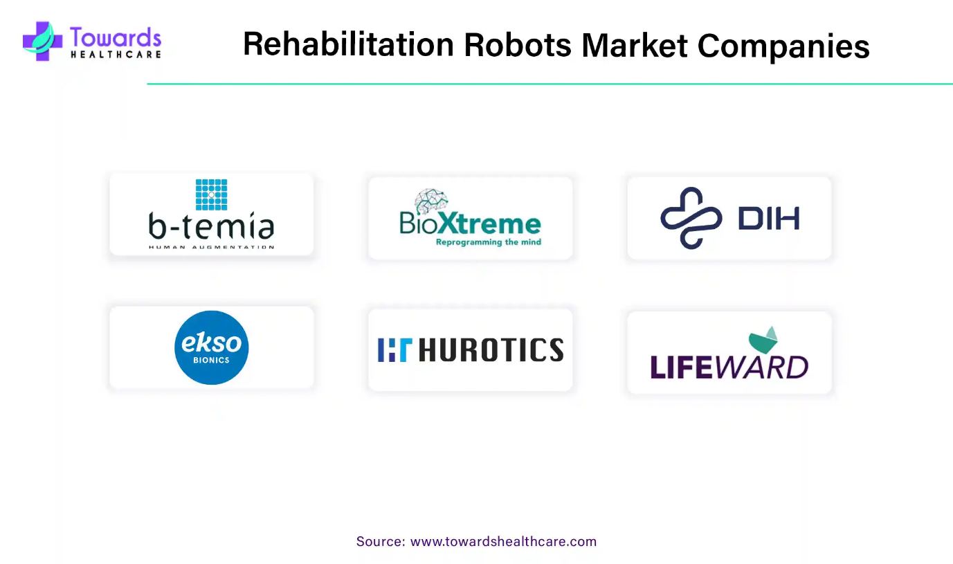 B-Temia, Inc., Bioxtreme Robotics Rehabilitation, Cyberdyne, Inc., DIH Holding US, Inc., Ekso Bionics, Hurotics, Lifeward Ltd., MediTouch, Ltd., Rehab-Robotics, Stryker Corporation, SynTouch LLC, Vecna Robotics, and WIRobotics.