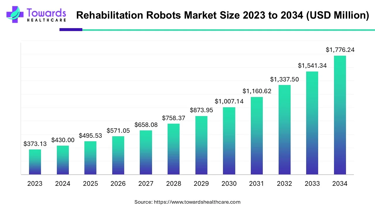 The global rehabilitation robots market size is calculated at USD 495.53 million in 2025 and is expected to reach around USD 1776.24 million by 2034, growing at a CAGR of 15.24% for the forecasted period.