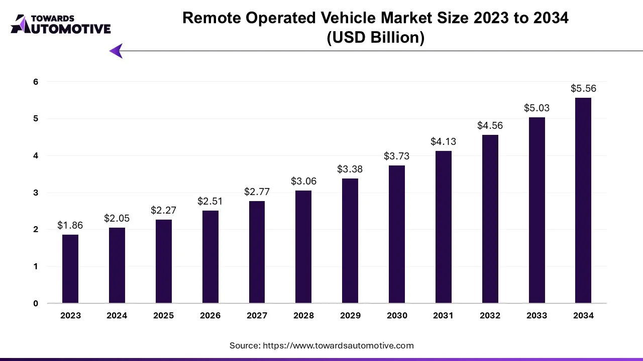 According to Towards Automotive consultants, the global remote operated vehicle (ROV) market is projected to reach approximately USD 5.56 billion by 2034, increasing from USD 2.05 billion in 2024, at a CAGR of 10.47% during the forecast period 2024 to 2034.