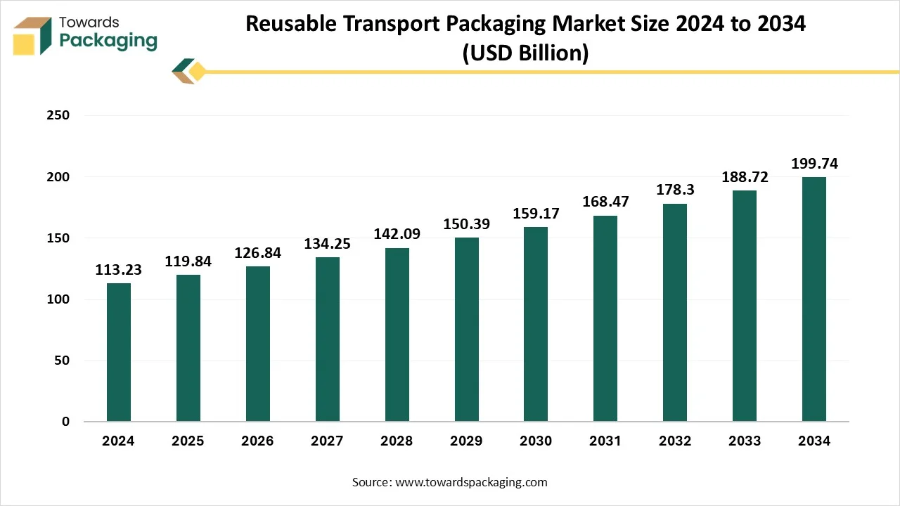 As per market analysts at Towards Packaging, the global reusable transport packaging market is expected to grow from USD 126.84 billion in 2026 to nearly USD 199.74 billion by 2034, registering a CAGR of 5.84% between 2025 and 2034.