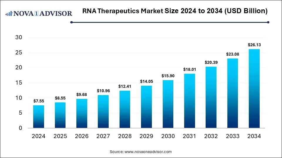 According to Nova One Advisor, the global RNA therapeutics market size is calculated at USD 8.55 billion in 2025 and is expected to be hit around USD 26.13 billion by 2034, growing at a compound annual growth rate (CAGR) of 13.22% over the forecast period 2025 to 2034. A study published by Nova One Advisor a sister firm of Precedence Research.
