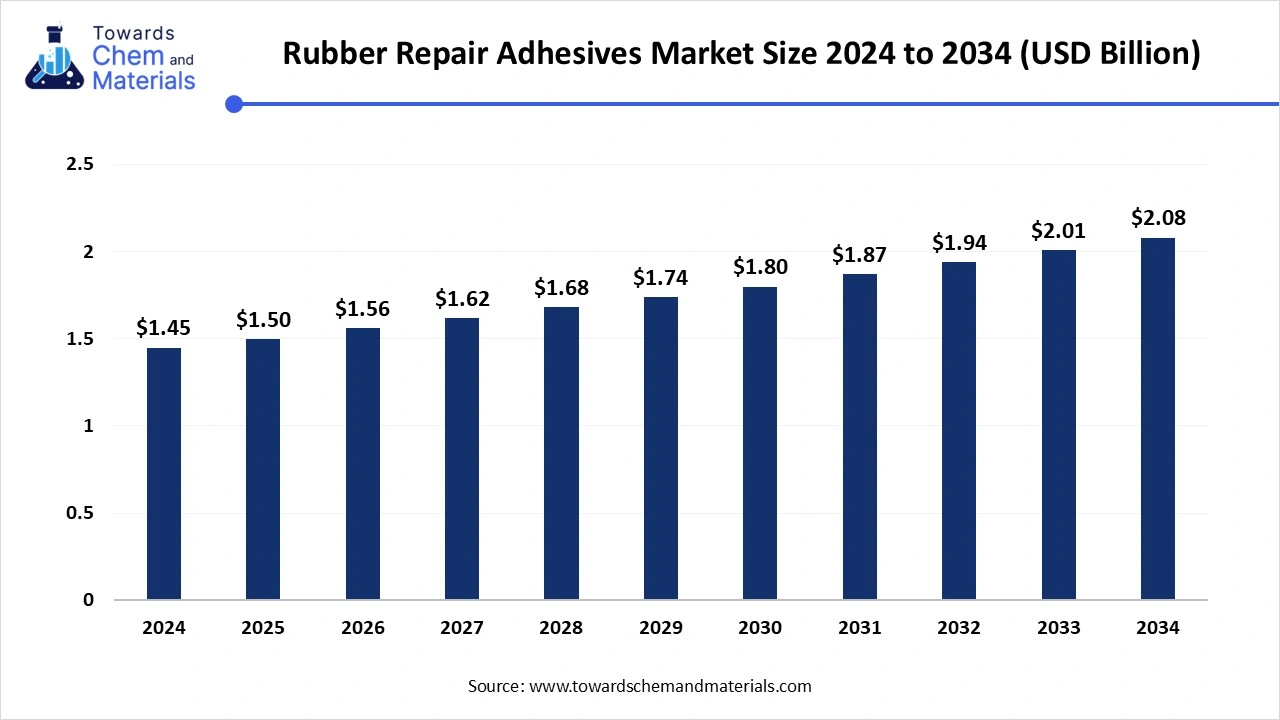 According to Towards chem and Materials Consultants, the global rubber-repair adhesives market size was USD 1.45 billion in 2024, calculated at USD 1.50 billion in 2025, and is expected to reach around USD 2.08 billion by 2034, expanding at a CAGR of 3.68% from 2025 to 2034