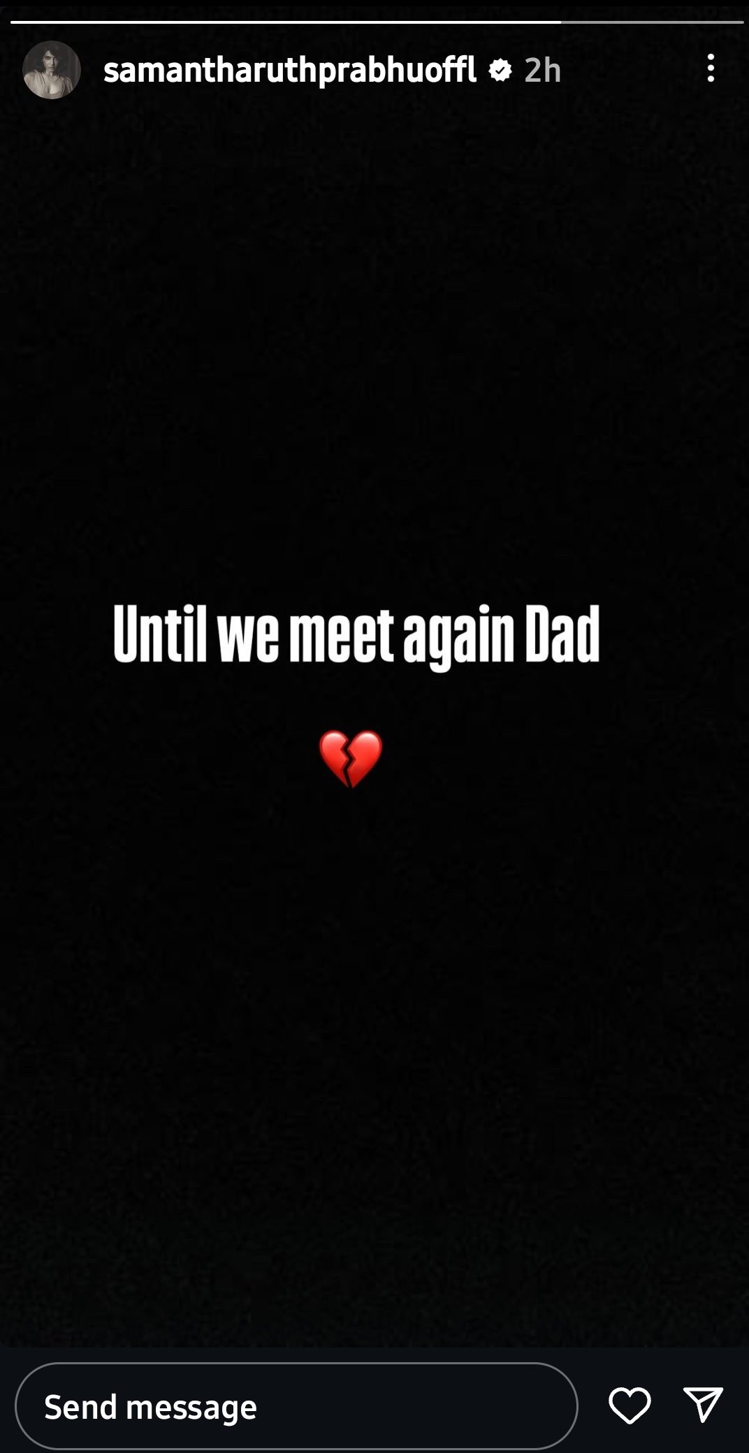 Joseph Prabu, Samantha Ruth Prabhu’s father, took his last breath today. The star used her Instagram Stories to update her fans. She wrote, “Until we meet again,” alongside a “heartbroken” emoji.