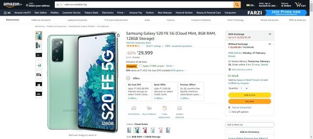 The Samsung Galaxy S20 FE 5G is now available at Rs. 29,999 instead of Rs. 74,990. Amazon has offered this fantastic deal on this smartphone. The pricing of this smartphone was originally set at Rs. 74,990, but Amazon is currently giving it away for an incredible 60% less, making it only Rs. 29,999. Amazon is even providing exchange and bank deals for this smartphone. On exchange, you can save up to Rs. 18,050.00.