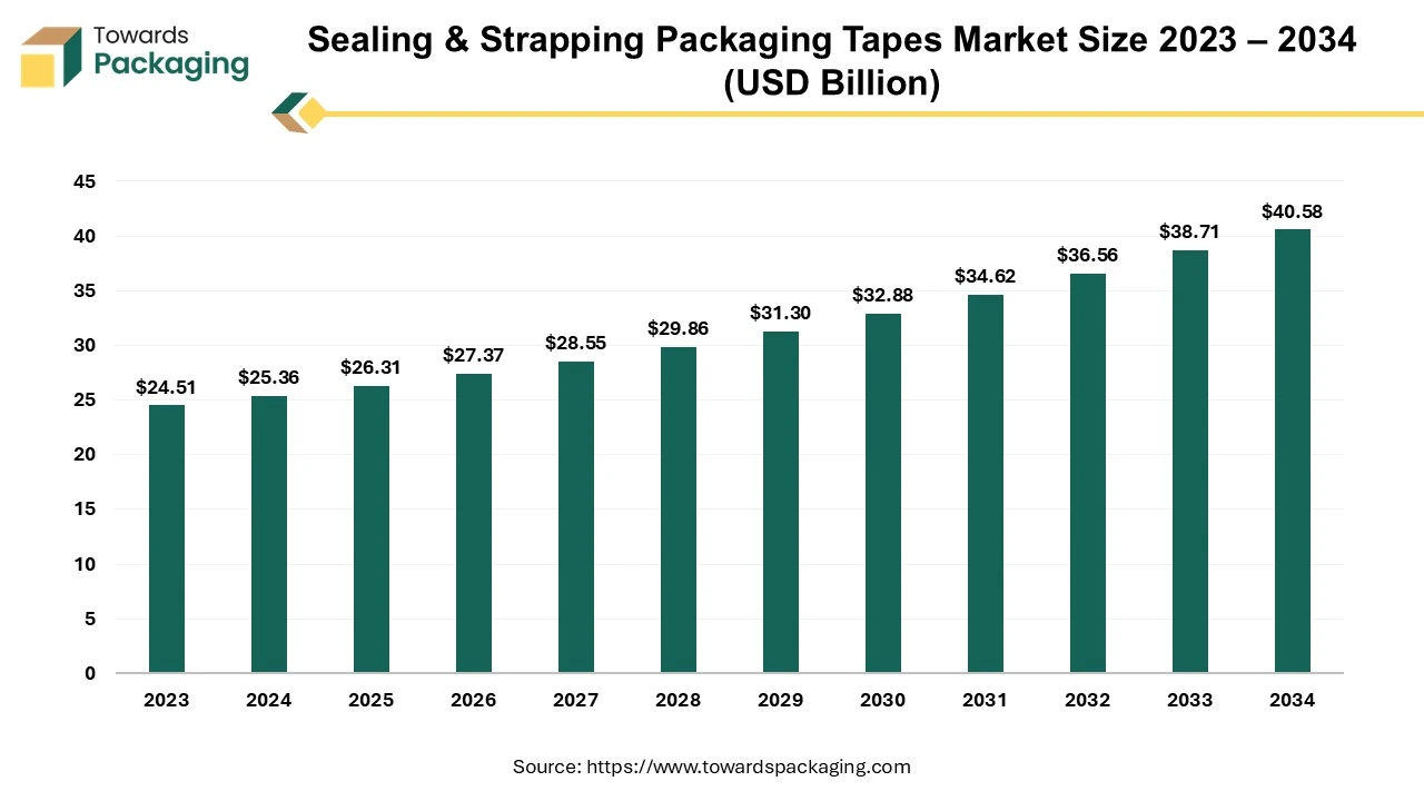 As reported by Towards Packaging experts, the global sealing and strapping packaging tapes market is anticipated to rise from USD 27.37 billion in 2026 to approximately USD 40.58 billion by 2034, with a CAGR of 4.81% from 2025 to 2034.
