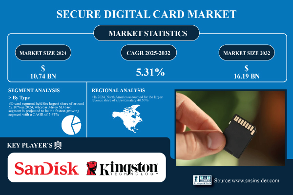 According to the SNS Insider,“The global Secure Digital Card Market size was valued at USD 10.74 Billion in 2024 and is projected to reach USD 16.19 Billion by 2032, growing at a CAGR of 5.31% during 2025-2032.”