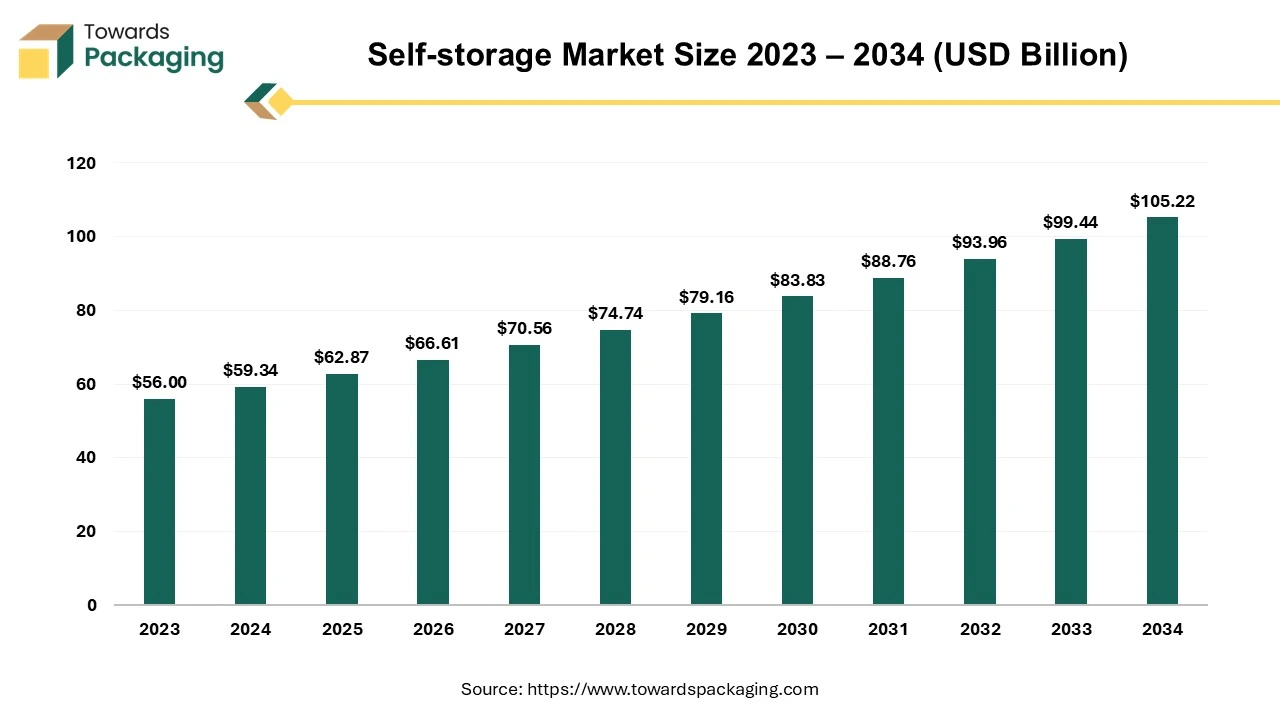 According to Towards Packaging consultant, the self-storage market size stood at USD 59.34 billion in 2024 and is predicted to exceed USD 105.22 billion by 2034, experiencing a CAGR of 5.95% from 2024 to 2034.