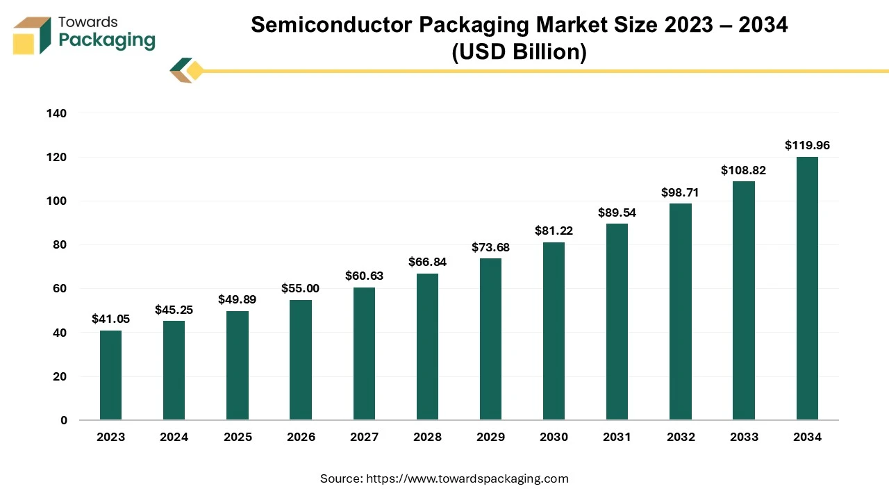 Ottawa, Feb. 20, 2025 (GLOBE NEWSWIRE) — The semiconductor packaging market size to record US$ 49.89 billion in 2025 and is projected to grow beyond US$ 119.96 billion by 2034, a study published by Towards Packaging a sister firm of Precedence Statistics.