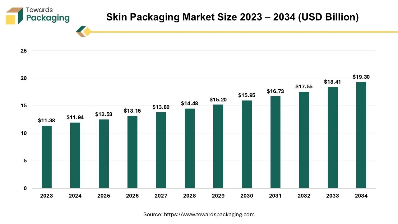 According to industry findings by Towards Packaging, the global skin packaging market will expand at a CAGR of 4.95% from 2025 to 2034, rising from USD 12.53 billion in 2025 to USD 19.30 billion by 2034.