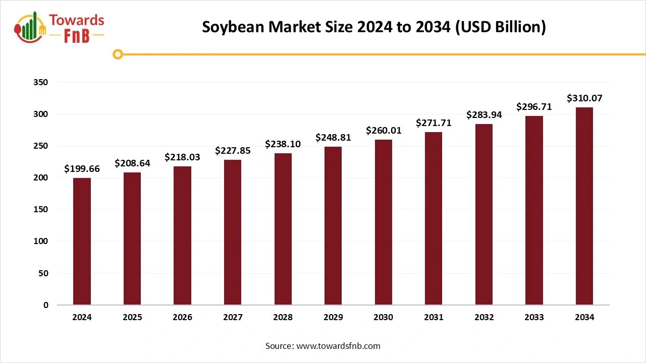 Ottawa, Nov. 04, 2025 (GLOBE NEWSWIRE) — The global soybean market size stood at USD 199.66 billion in 2024 with projections indicating a rise from USD 208.64 billion in 2025 to reach USD 310.07 billion by 2034, according to a report published by Towards FnB, a sister firm of Precedence Research.