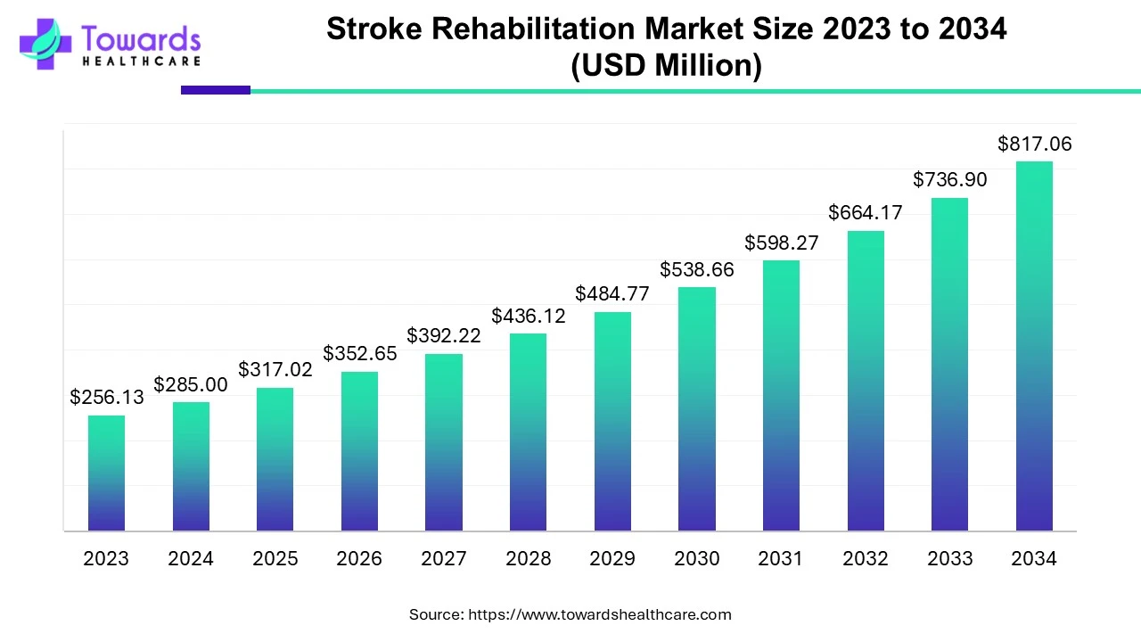 The global stroke rehabilitation market size is calculated at USD 317.02 million in 2025 and is expected to reach around USD 817.06 million by 2034, growing at a CAGR of 11.24% for the forecasted period.