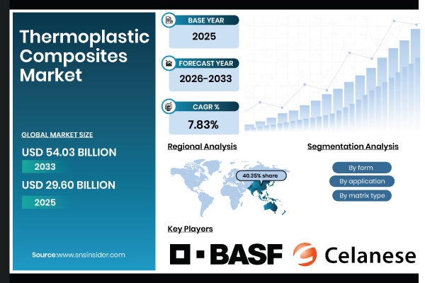 Austin, Jan. 06, 2026 (GLOBE NEWSWIRE) — According to SNS Insider, The Thermoplastic Composites Market size is estimated at USD 29.60 Billion in 2025 and is projected to reach USD 54.03 Billion by 2033, growing at a CAGR of 7.83% during 2026-2033. Growth in the market for thermoplastic composites is being driven by the automotive and aerospace and military industries’ increased usage of lightweight, recyclable innovative materials.