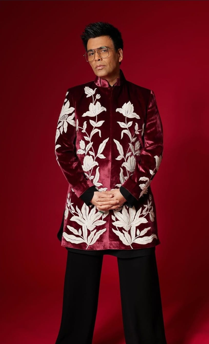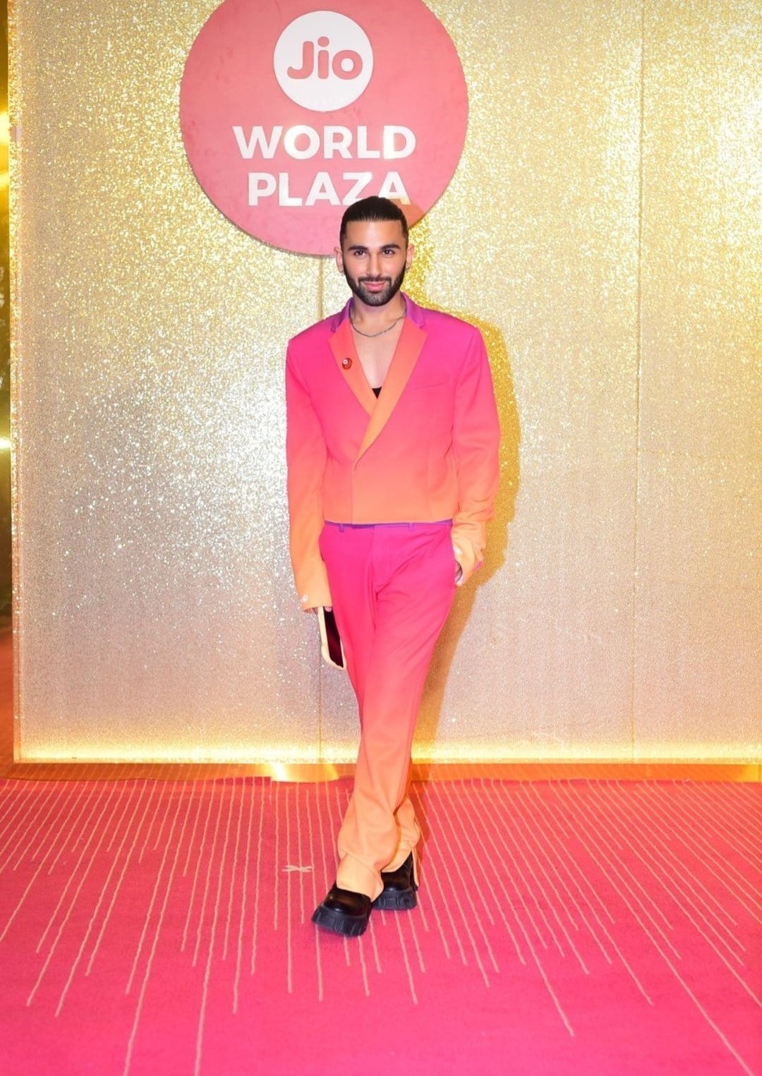 Orry Awatramani dressed in a sunset-hued cropped suit and trouser set.