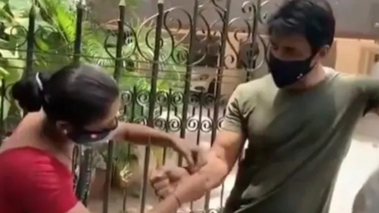 During Sonu Sood's interaction in Mumbai, a female fan tied a rakhi to his wrist, touching his feet.