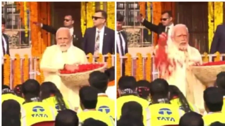 Prime Minister Narendra Modi showered flower petals on the workers who were a part of the Ram Temple construction crew in Ayodhya…