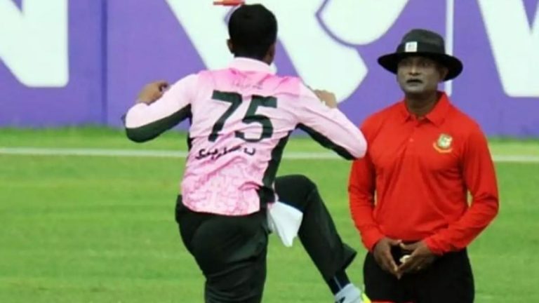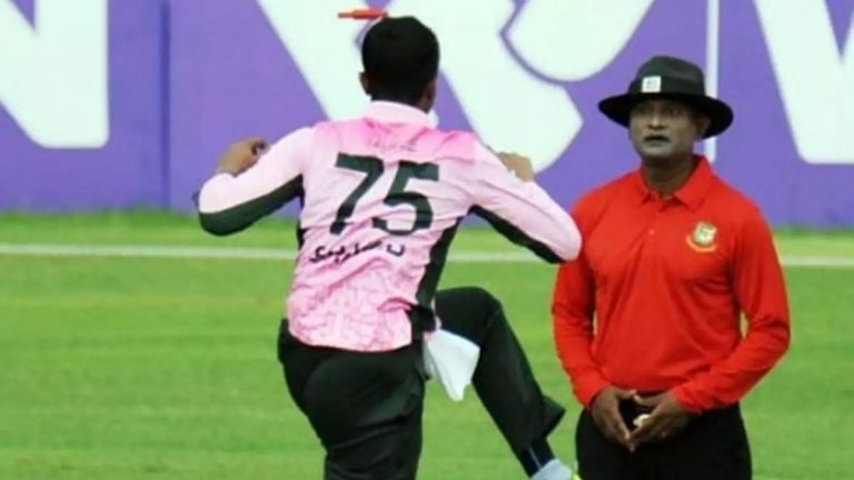 Bangladesh cricketer Shakib Al Hasan who showed dissent against the umpire’s decisions by kicking and uprooting the stumps during a…