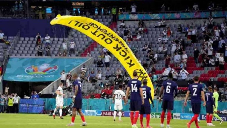 Greenpeace has apologized and Munich police are investigating after a protestor parachuted into the stadium and injured two people before…