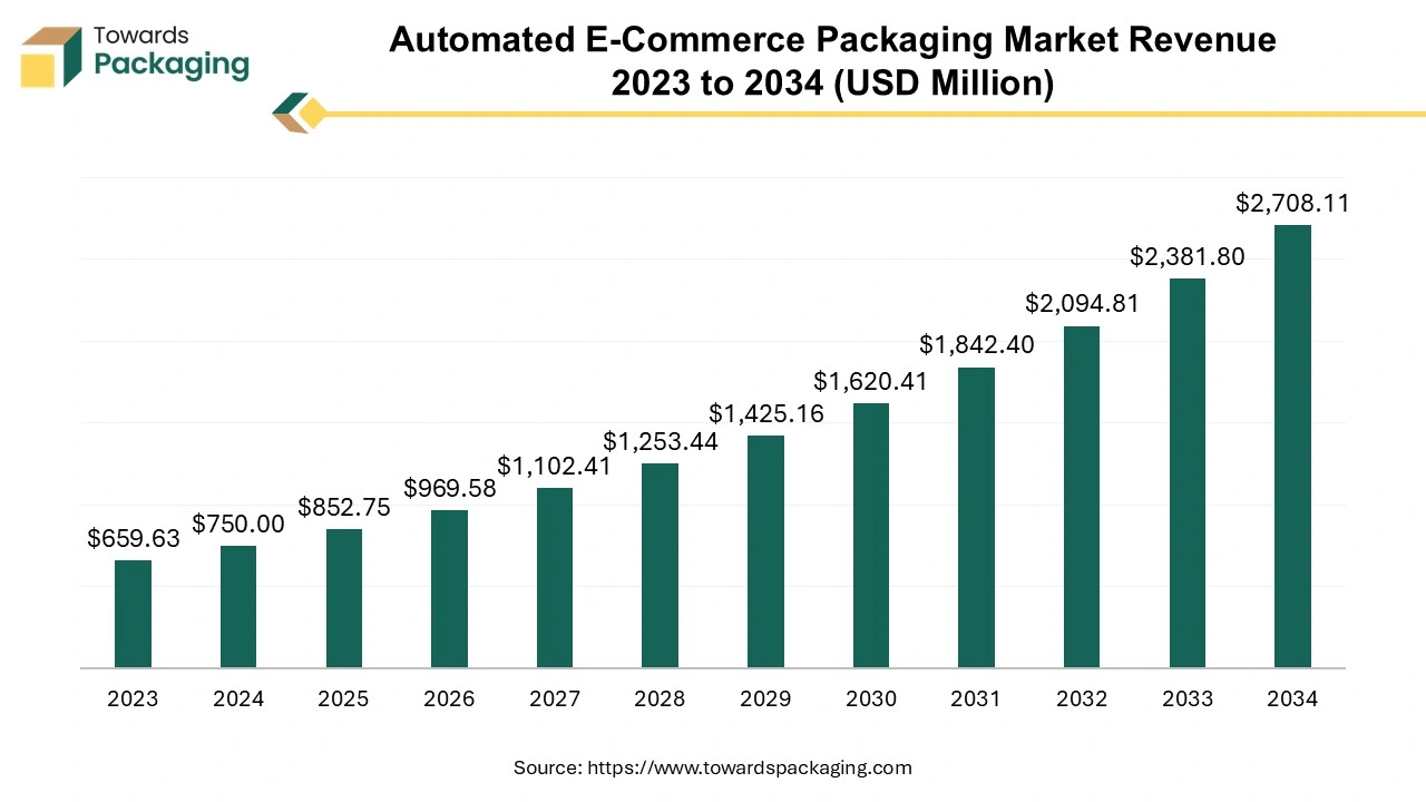 According to researchers from Towards Packaging, the global automated e-commerce packaging market, estimated at USD 852.75 million in 2025, is forecast to expand to USD 2708.11 million by 2034, growing at a CAGR of 13.7% over the forecast period.