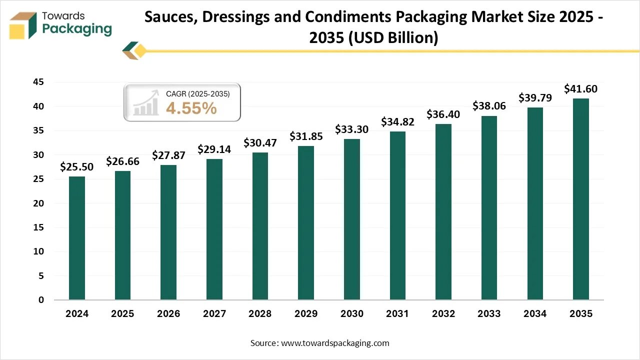As reported by Towards Packaging experts, the global sauces, dressings and condiments packaging market is anticipated to rise from USD 27.87 billion in 2026 to approximately USD 41.60 billion by 2034, with a CAGR of 4.55% from 2025 to 2034.