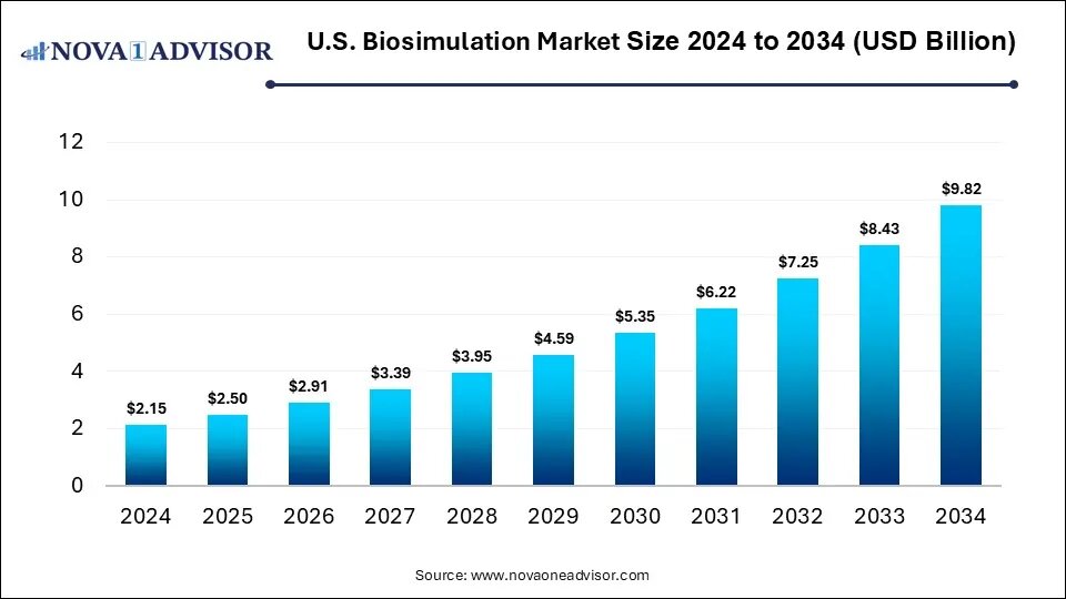According to Nova One Advisor, the U.S. biosimulation market size is calculated at USD 2.50 billion in 2025 and is expected to be worth around USD 9.82 billion by 2034, growing at a compound annual growth rate (CAGR) of 16.4% over the forecast period 2025 to 2034. A study published by Nova One Advisor a sister firm of Precedence Research.