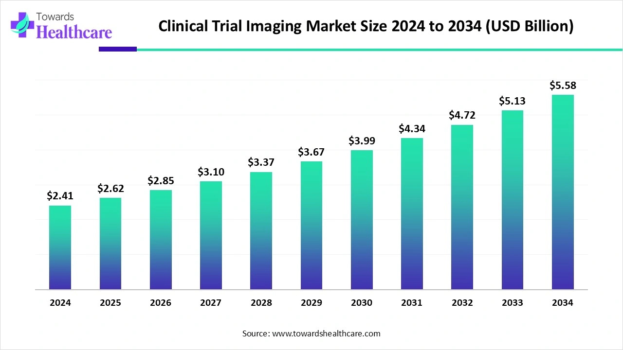 - The global clinical trial imaging market is set to grow from US$2.41 billion in 2024 to US$5.58 billion by 2034, at a CAGR of 8.8%.