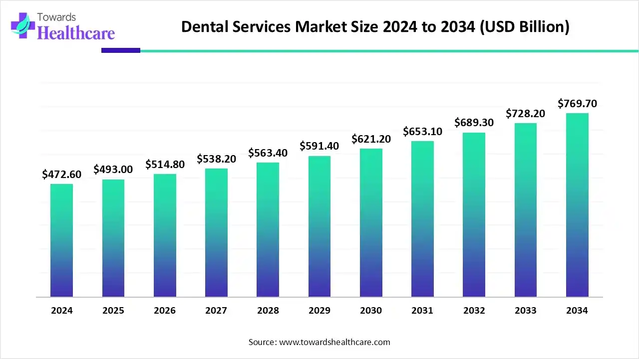 • The global dental services market will rise from USD 472.6 billion in 2025 to USD 769.7 billion by 2034, growing at a CAGR of 5.1%.