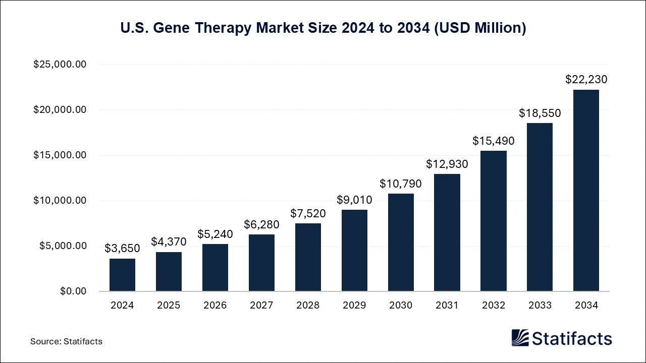 Ottawa , Feb. 21, 2025 (GLOBE NEWSWIRE) — The U.S. gene therapy market size was valued at USD 3,650 million in 2024 and is expected to surpass around USD 22,230 million by 2034, growing at a compound annual growth rate (CAGR) of 19.8% over the forecast period 2025 to 2034, a study published by Statifacts a sister firm of Precedence Statistics.